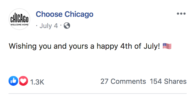 A recent report published by Rival IQ has the average engagement rate across industries on Facebook as less than 1%. However, Choose Chicago’s post has an engagement rate of 42%. It might seem that, of course, an image of a flag would generate a lot of engagement on the 4th of July. However, there’s more going on here than the holiday. Choose Chicago’s high engagement rates is based on a deliberate plan to engage and deliver high-quality content.