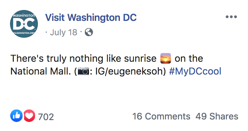 I’ve always been told a smile never hurt anyone, but it may brighten someone’s day. Social media is about being social, and socializing is a two-way process. Destination DC needs to engage with its audience. They can do something as simple as setting the goal of interacting with a third of those who comment by either liking the comment or responding to the comment or post. Sometimes it really is the simple things.